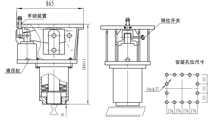 主要設(shè)計特點: 常閉式設(shè)計、采用液壓站集中驅(qū)動控制以特制碟形彈簧實現(xiàn)頂軌制動; 摩擦塊采用先進的高耐磨鋼,性能可靠; 設(shè)有限位開關(guān),顯示工作狀態(tài); 帶手動釋放,安裝維護方便。