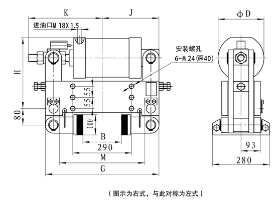 額定夾緊力為:50KN,輪寬160,左式配置,其訂貨標(biāo)記為YLBZ25-160-左;右式配置為YLBZ25-160-右。